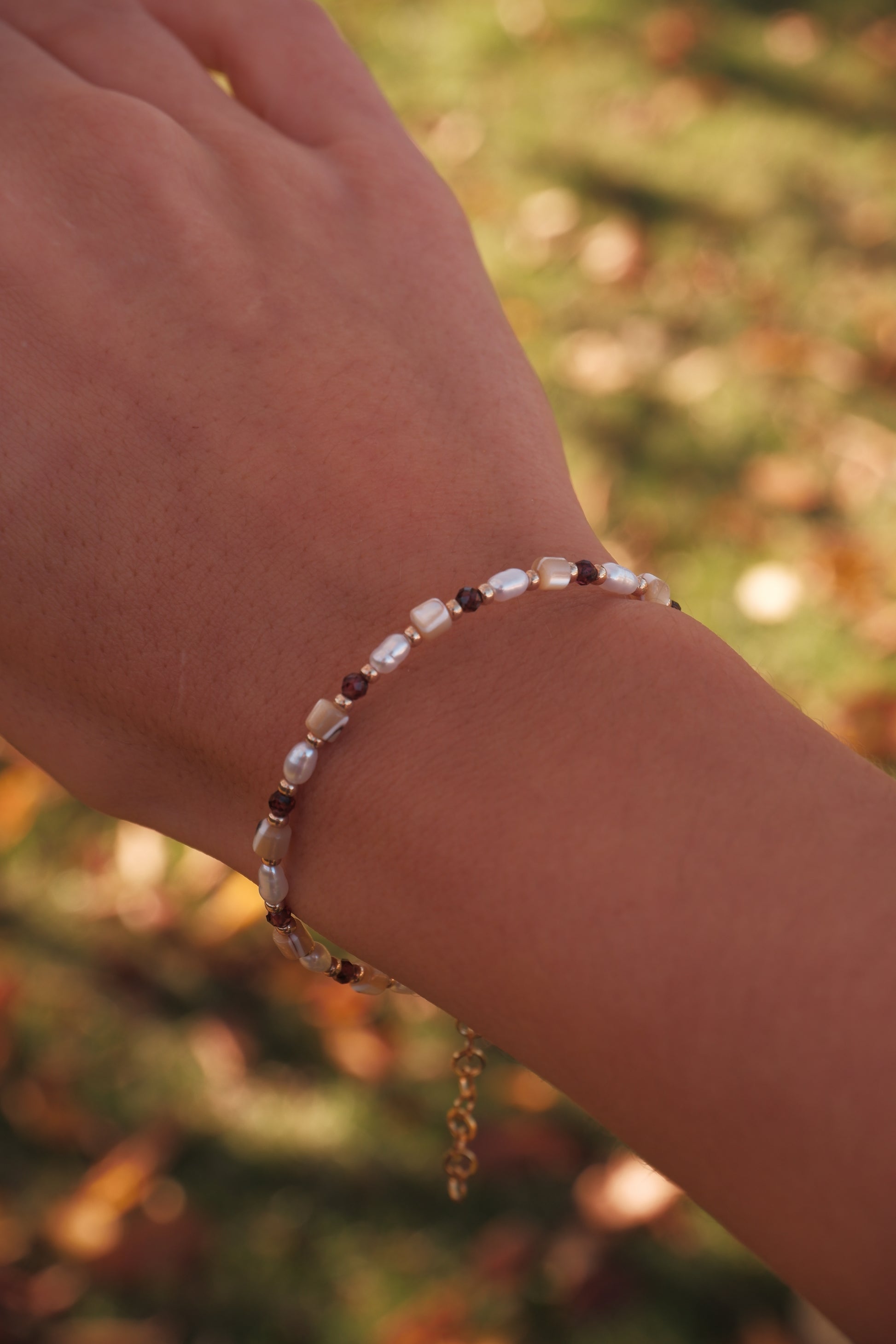 Natural garnet, natural shell beads and natural freshwater pearls. Handmade. Stainless steel finishing.