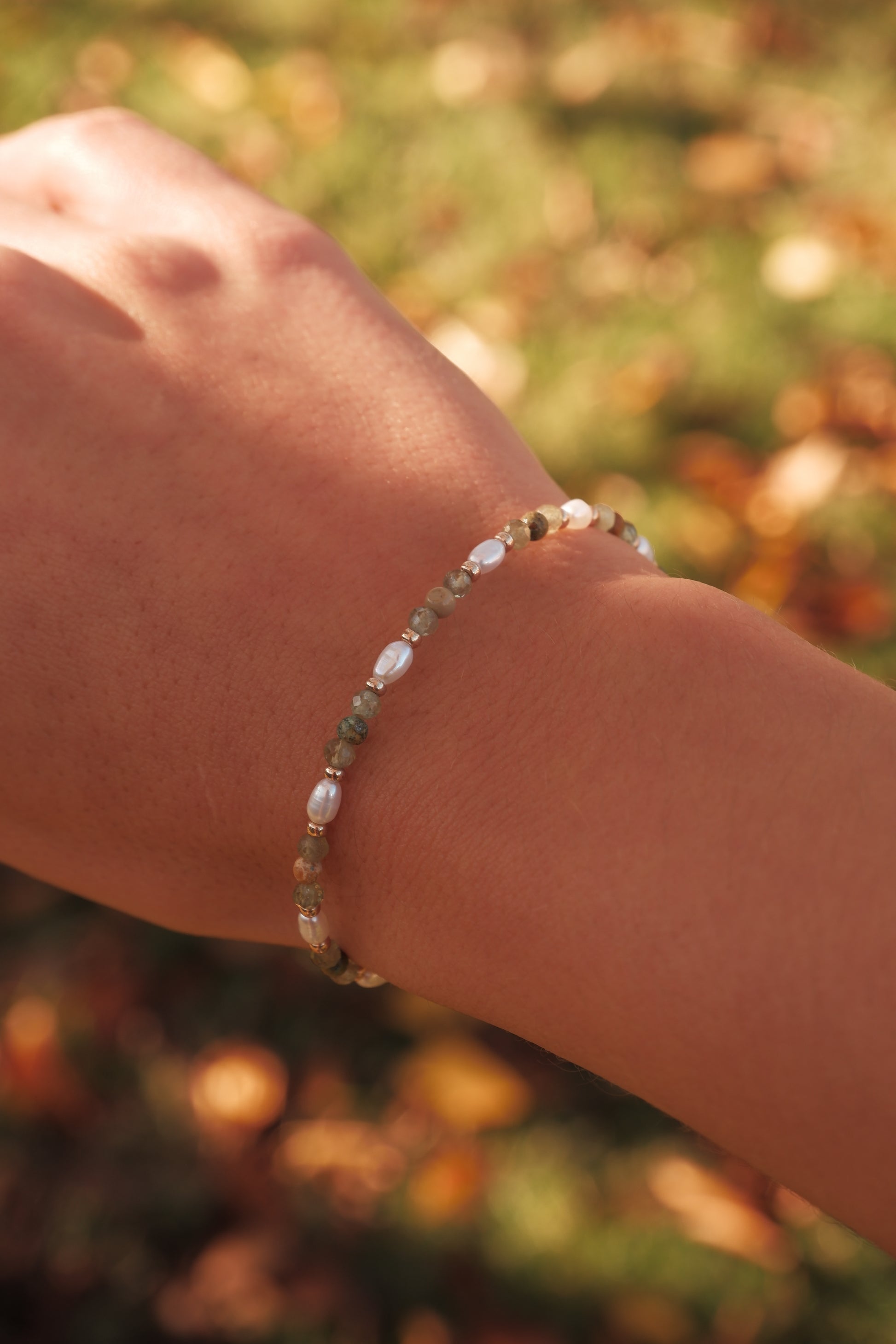 Handmade bracelet with natural green apatite, turquoise and freshwater pearls. Stainless steel finishing. Adjustable length of 16-19cm.